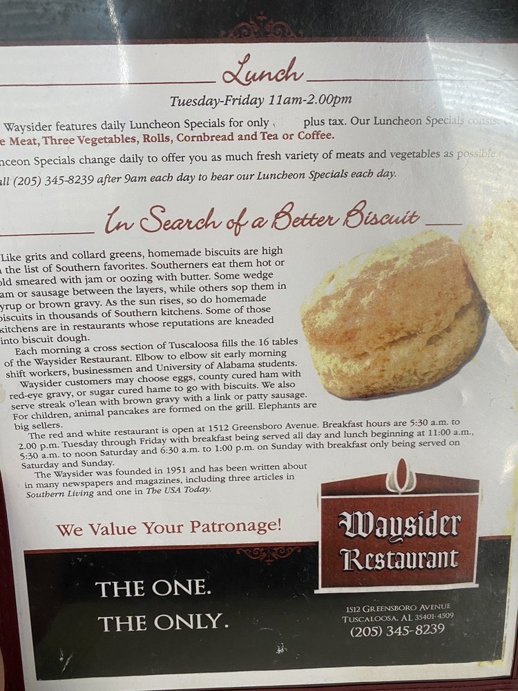 Welcome to Waysider Restaurant, a hidden gem in Tuscaloosa, AL, where culinary creativity meets delightful flavors. Specializing in seafood and Mexican cuisines, this eatery also excels in breakfast and brunch offerings that are sure to invigorate your mornings.
